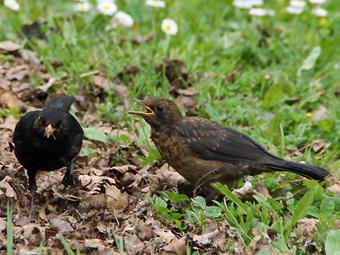 Pour commencer, la leçon va au plus facile. Les platebandes du jardin. Il suffit de faire voler les feuilles mortes pour déloger vers et insectes. Le petit regarde attentivement sans vraiment comprendre ce qu’on attend de lui. Dès qu’un ver apparaît, il le réclame à grands cris. Bon prince, le merle le lui donne. Une, deux, trois fois… Mais bientôt il se lasse. Et, sous les yeux interloqués du merleau, il engloutit la gourmandise. A toi de jouer maintenant !