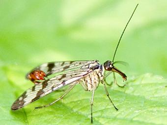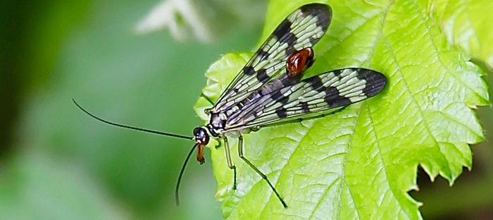 Sans doute l’un des hôtes les plus étranges du jardin. Comme si la Mouche scorpion (Panorpa vulgaris) portait un masque de la Commedia dell’arte ! Une tête minuscule, deux très longues antennes, deux yeux globuleux rougeâtres et, surtout, un « bec » orangé démesuré…