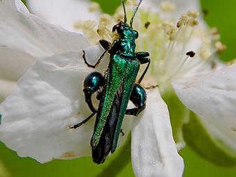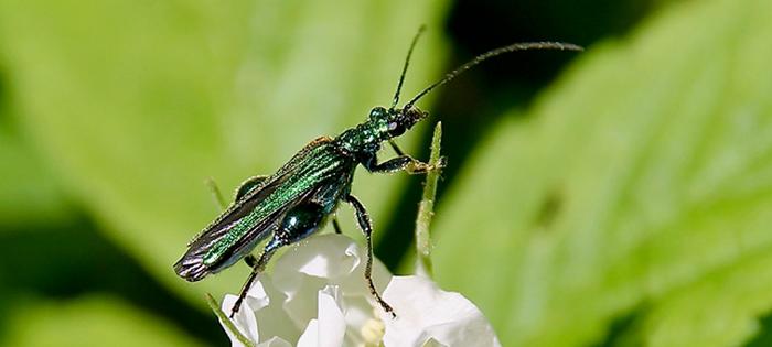 Inoffensif, l’Oedémère noble se laisse aisément approcher lorsqu’il broute les fleurs du jardin ou des haies. Moins vorace que la Cétoine dorée ou le drap mortuaire, il se contente des petits sacs de pollen. Noble et délicat !