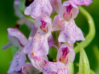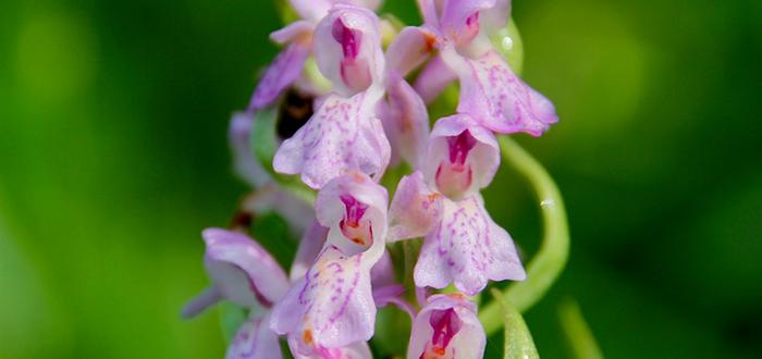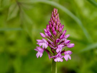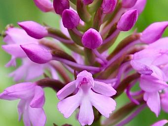 Plus coniques que pyramidaux, les épis floraux commencent à s’épanouir par la base. Avec de petites fleurs uniformément rose pâle, sans tâches ni marbrures. Seule exception à cette sobriété, la lèvre inférieure est profondément trilobée.