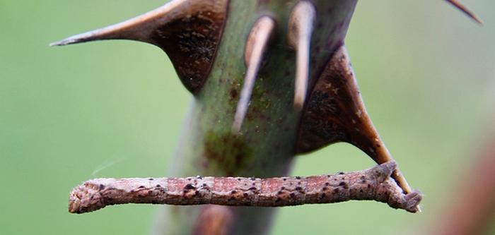 La famille des Phalènes est extrêmement nombreuse. La plupart arborent ainsi des ornements sophistiqués. Elles ont aussi en commun le comportement original de leur progéniture. Au moindre danger, comme celle-ci (indéterminée), les chenilles arpenteuses s’immobilisent « en mode brindille ». Comment mieux tromper la convoitise des prédateurs ?