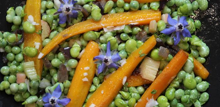 En ce début de saison, les légumes primeurs sont si tendres, si juteux, qu’ils ont à peine besoin d’être cuits ! Même les carottes deviendront fondantes tout en restant fermes. Le plus long est finalement de ramasser (mais quel plaisir au petit matin) et d’écosser petits pois et févettes.