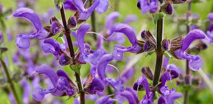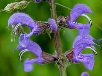 Si les larges rosettes de son feuillage gaufré - moins aromatique que celui de la Sauge officinale - restent pour l’essentiel plaquées au sol, ses hauts épis sont spectaculaires. Autour de solides hampes ramifiées, un peu poisseuses, une multitude de fleurs à deux lèvres, amples, mais étroites, s’ordonnent en de ravissantes couronnes échelonnées. D’un bleu violacé intense.