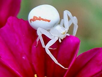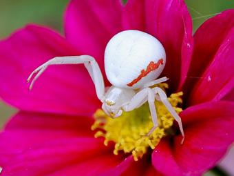 Figée au cœur de la fleur de cosmos, la petite araignée est étrangement belle. Le corps blanc nacré, barré d’une ligne latérale rouge-orangé, le thorax et les « pattes de crabes » presque translucides. Prête à saisir le premier butineur venu.