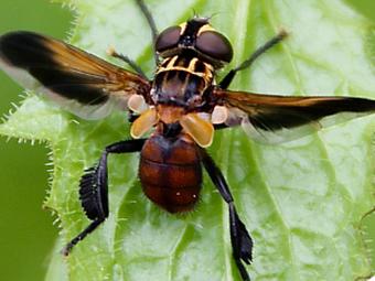 Le Tachina magnicornis est facile à reconnaître, avec cet abdomen orangé, marqué d’une large ligne centrale de losanges noirs. Un abdomen courtaud, replet, hérissé de quatre rangs d’épaisses soies noires.
