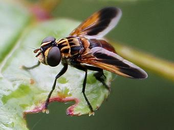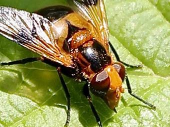 Deux gros yeux brun-rouge disjoints (c’est une femelle) sur une face jaune-orangé. Y compris les courtes antennes. Des ailes transparentes fortement nervurées, teintées d’orange puis comme taguées de noir. Une double ligne rouge-brique sur les bordures du corselet, lui-même marqué d’un charmant petit cœur orangé, en lisière du scutellum brique. Et enfin, deux demi-lunes orangées à l’avant de l’abdomen noir. Avouons que tout cela ne manque pas d’harmonie.
