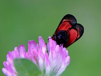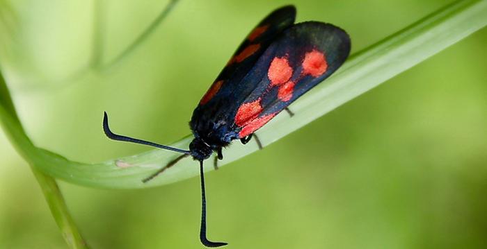 Familière des prairies humides, la Zigène du trèfle se distingue de ses cousines par le nombre et la disposition des taches rouges des ailes antérieures. Mais les postérieures sont toujours uniformément rouges. Bordées de noir. On les perçoit bien ici à la faveur d’un butinage acrobatique !