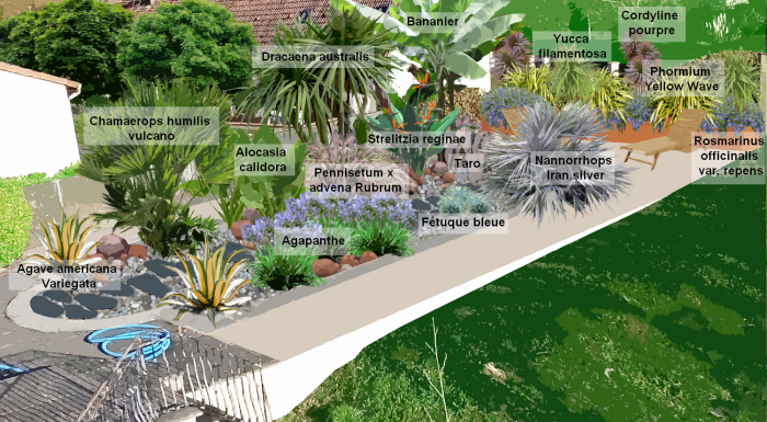 Les végétaux employés pour l'aménagement de la piscine en jardin exotique :