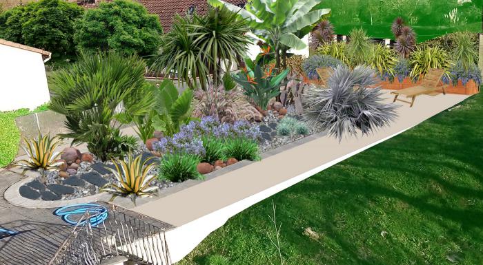 Nous avons face au séjour une piscine : 6 m de large et 11 m de long. Les travaux de rénovation étant très coûteux, nous aimerions la combler pour y faire des plantations. J'aimerais vous demander si vous avez des conseils, des idées d'aménagement de ce parterre de style exotique. En effet, je compte faire construire une jardinière de 9 m de long pour fermer un côté de la piscine et y faire des plantations de style exotique ( palmier, cordyline, phormium) pour cacher un vis-à-vis avec la rue.