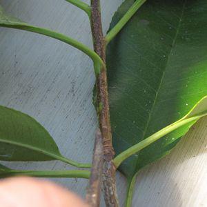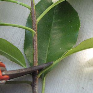 En septembre sur un photinia adulte (demandez à un voisin qui en possède),repérez des rameaux de l'année. Ils seront facilement identifiables grâce à la couleur brune de la tige, verte en son sommet. Sélectionnez des rameaux de 25 à 30cm. Ils portent un bourgeon terminal._voir image_