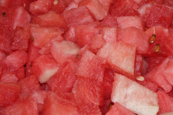 Prenez une pastèque. Coupez-la en tranches, retirez l’écorce et la partie où se trouvent les graines. Coupez la pulpe en morceaux assez minces. Mettez les morceaux et le sucre en couches alternées dans une terrine et laissez