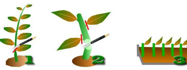 *2 _ coupez des morceaux de tige comportant 3 à 4 feuilles, et supprimez les feuilles du bas pour n’en garder qu’une au sommet de la bouture