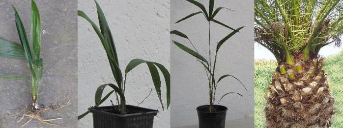 Les jeunes palmiers sont mis en godet de 8 ou 10 cm au stade deux ou trois feuilles (voir l’exemple ci-dessous) dans un mélange de 1/3 de terreau de feuilles, 1/3 de bonne terre de jardin de ph neutre et 1/3 de sable grossier.