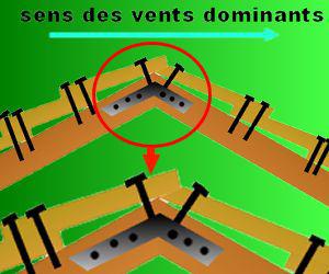 *découpez des poteaux de bois en biais comme sur le plan. C’est la longueur des bois découpés qui vous donnera la hauteur du faitage. Faites des coupes soignées pour qu’il repose de façon stable sur les planches de débordements. Assembler le haut par des cornières plates.