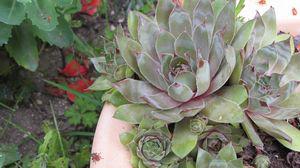 Au pied d’un tilleul, une ancienne margelle de puits sert de banc et permet d’admirer toute une collection de joubarbes, retombant de vieux pots de terre cuite.