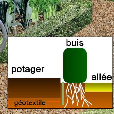Pour entourer les carrés, des buis sont plantés. Pour éviter que les racines des buis rentrent en concurrence avec les légumes ou les fleurs, à la plantation, il est installé une bande de géotextile sur une hauteur de 30 cm. Cette bande est mise à l’intérieur des carrés uniquement. La terre à l’intérieur de ces carrés ou massifs est surélevée de 10 cm par rapport aux allées, pour un bon drainage.