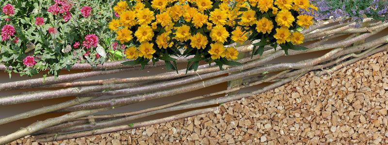 Certainement la plus romantique des bordures d’allée de jardins. Elle est faite de rameaux tressés avec de petits piquets fichés dans le sol. Elle sera idéale dans un jardin campagnard. Malheureusement elle se dégrade vite. Vous pourrez augmenter sa durée en la maintenant toujours propre.