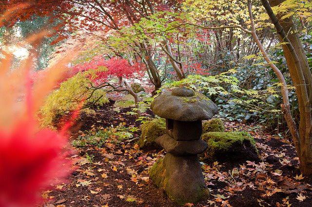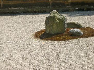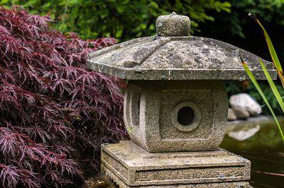 Les éléments symboliques : la lanterne de pierre, les pierres transcendantes (empilement de pierres plates).