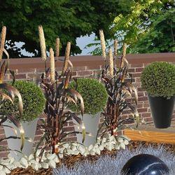 Les plantes : elles sont taillées pour harmonieusement intégrer l’espace en ayant soin de conserver leur structure. Les fleurs vives de saison sont présentes, mais sans dominer l’un ou l’autre élément.