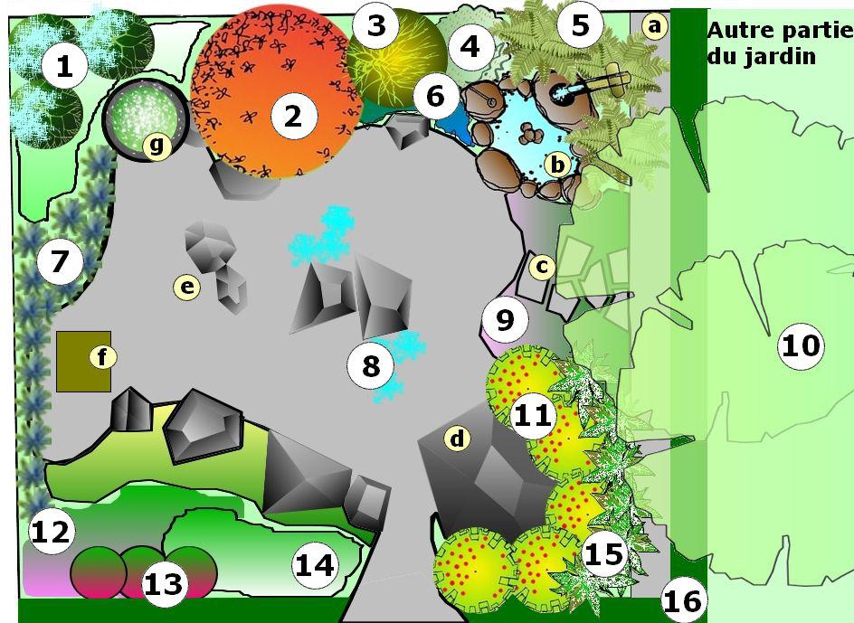 C'est un jardin de mi-ombre. Cette ombre sera créée en cas d’orientation du jardin au sud par les végétaux structurants.