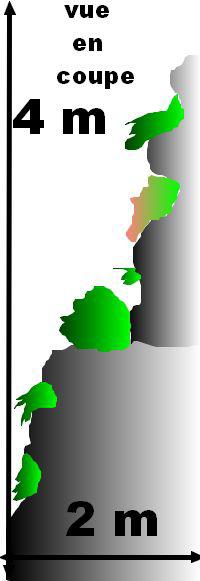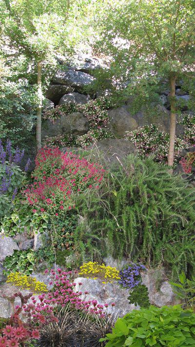 Dans cet exemple la pente n'est pas la seule contrainte, mais c'est surtout la présence des rochers. Un tel aménagement est mené par une entreprise de terrassement. Lors de la mise en œuvre, dites à l’entrepreneur d’insérer de la terre au fur et à mesure de l’empilement des pierres.