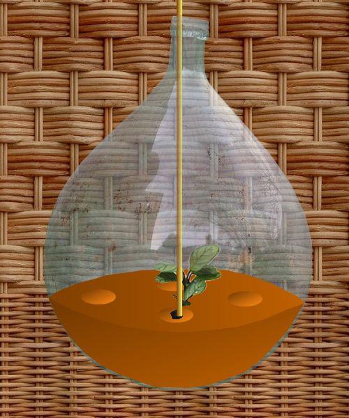 Ce qui apparaît sur les parois internes de votre bonbonne n’est pas une moisissure, mais des Algues microscopiques qui profitent d’une condensation importante pour proliférer. N’employez surtout pas de produits pour le lavage des vitres ou autre produit algicide. Vous nuiriez à la santé de vos plantes. Faites-vous comme sur le dessin une petite éponge fixée à un fil de fer rigide qui puisse passer par le goulot de la bonbonne.