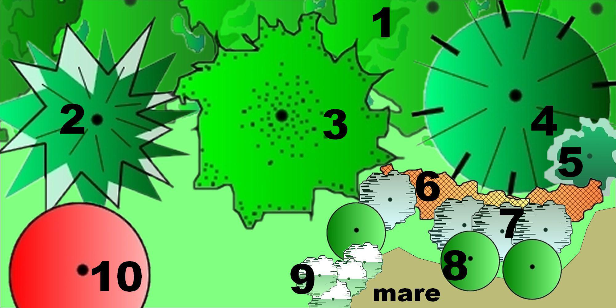 L’arrière-plan est constitué d’érables champêtres (1). Ce bosquet, sans l’arrière-plan, peut être reproduit dans un petit jardin, mais le gazon est remplacé par des gravillons.