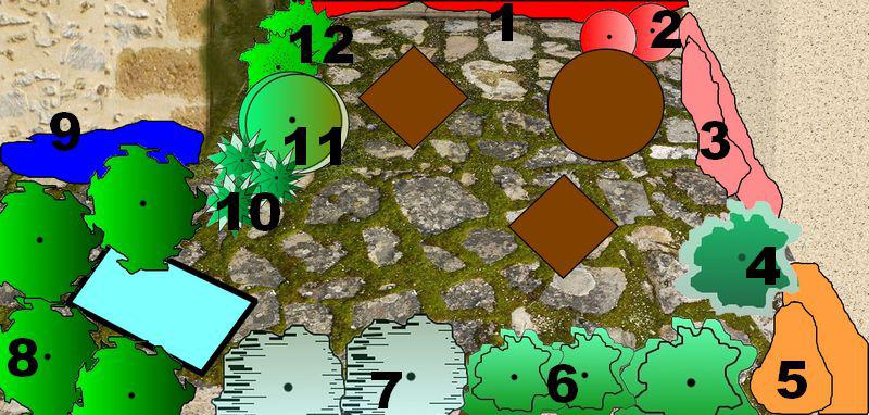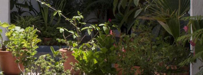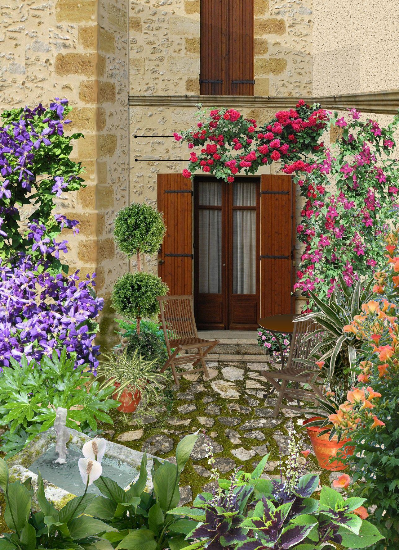Tout doit être fait pour divertir l’œil. plusieurs centres d’intérêt comme sur cet exemple : les plantes grimpantes sur les murs, une petite table de fer forgé chinée chez un brocanteur, plusieurs sortes de poteries aux formes et couleurs différentes (mais toujours dans une même gamme de ton).