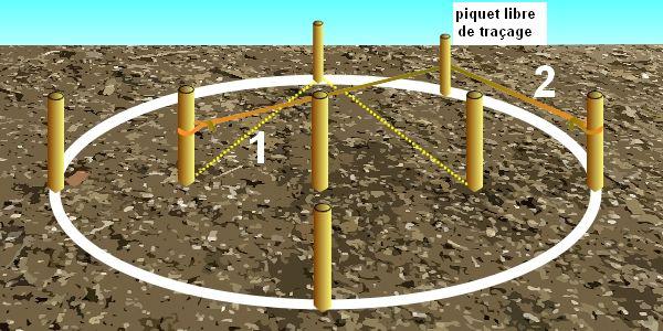5_ Tendez la corde avec votre petit piquet de traçage et déplacez celui-ci la corde bien tendue. En 2