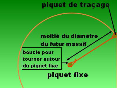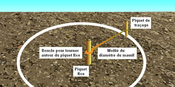 1_ Enfoncez un piquet dans le sol au milieu de votre futur massif.
