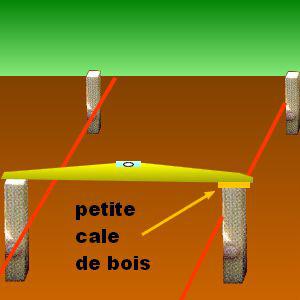Mettez les petits piquets de niveau dans le sens de la largeur. Pour éviter les flaques d’eau, inclinez légèrement votre allée pavée d’un côté. Comptez 1 cm pour 1 m. Pour ce faire, mettez une petite cale sur l’un des piquets, sa hauteur est celle de la pente voulue. L’eau peut ainsi s’infiltrer dans la terre. Il est possible aussi de faire une allée bombée, mais cela est plus difficile, il faut un piquetage supplémentaire au centre.