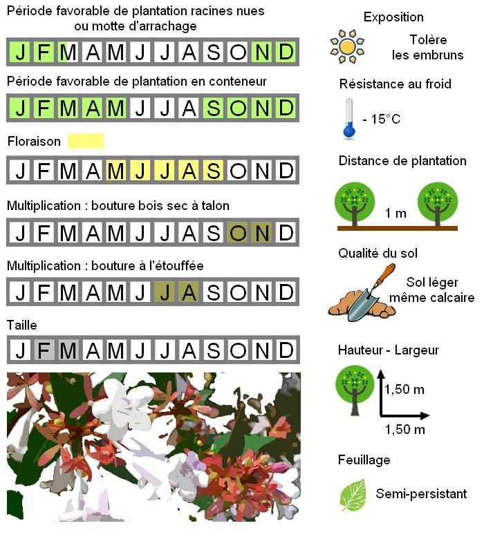 Arbuste à feuillage semi –persistant. Ce ne sont pas de grands arbustes. Ils peuvent très facilement rentrer dans l’aménagement de petits jardins de ville, ou même en bac sur une terrasse. C’est aussi un arbuste intéressant, car il fleurit tout l’été. Les fleurs, souvent parfumées, sont des petites clochettes allant du blanc au rose soutenu, et sont entourées de bractées colorées.