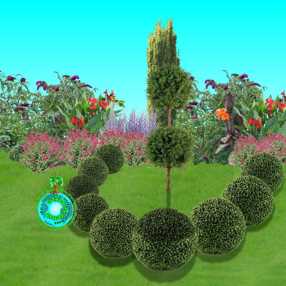 Une fois le cadran solaire matérialisé, il suffit de remplacer les pierres par des buis en boule, et le piquet par un buis tige surmonté d’une boule.