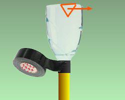 Faire un cueille-fruit est simple. Coupez une bouteille plastique en deux. Enfoncez une tige de bois ou un ancien manche. Scotchez fermement l’ensemble. Pour récupérer plus facilement les fruits en pinçant leur pédoncule, taillez dans le bord du cueille-fruit créé un V (en rouge sur la photo).