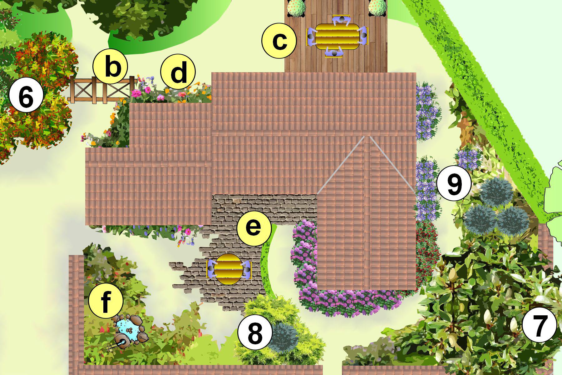 Ce jardin fait 40 m dans sa plus grande longueur. La maison est à étages.
