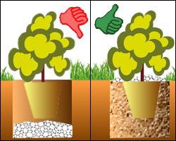 Ne mettez jamais au fond du trou des graviers comme cela est souvent préconisé, mais mélangez les graviers à l’ensemble de la terre du trou. (Formation d’une poche d’eau entrainant la pourriture des racines !)