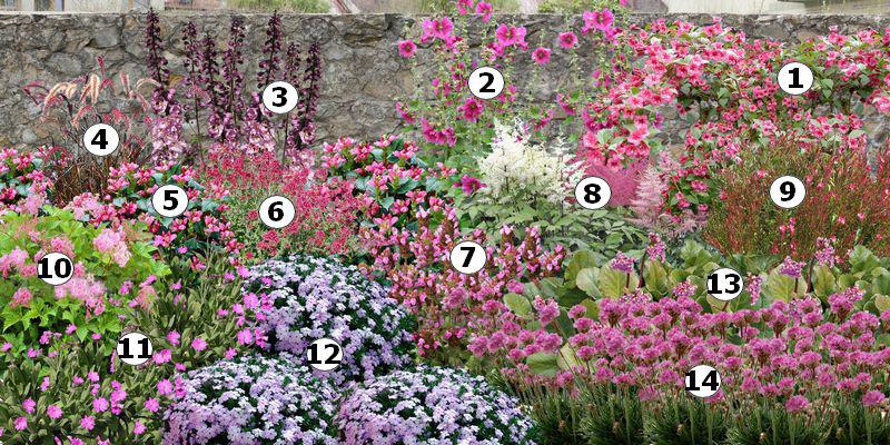 Pour mettre en valeur les différents roses, allant du violine au rose soutenu, utilisez aussi des plantes à feuilles d’un vert soutenu.