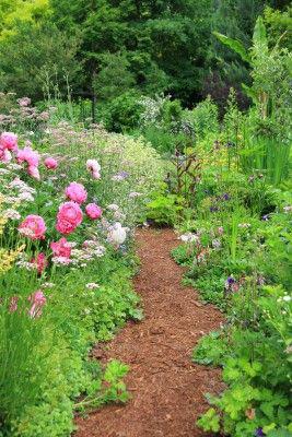 Typiques des jardins anglais, les abords des allées sinueuses de ces deux jardins sont colonisés par la végétation. Sur cet exemple l’allée est en gravillons stabilisés, sur l’exemple de droite l’allée est recouverte de paillis.