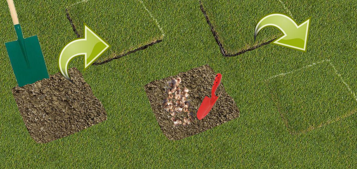 Pour ne pas abimer votre gazon, enlevez-en une plaque, et plantez vos bulbes en groupe.