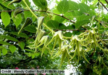 Les fleurs en forme de clochettes vertes se développent en grappes au sommet des tiges, en juin. Elles donnent naissance à des gousses de 10 cm qui deviennent d’un beau bleu cobalt, de septembre à novembre.