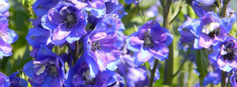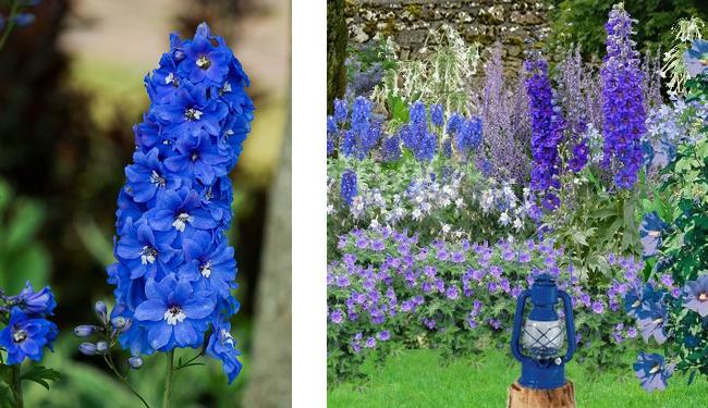 Toute la gamme des bleus est déclinée chez les delphiniums : du bleu pâle délicat et fragile, au bleu intense outremer, presque noir. (voir un jardin bleu)