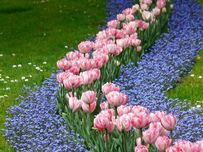 Cette scène maintes fois utilisée dans les grands parcs avec plus ou moins de bonheur est là saisissante avec cette ligne sinueuse de tulipes roses, soulignée de myosotis bleu des Alpes. Une scène que vous pouvez facilement reproduire dans votre jardin et pour le fleurissement estival planter des annuelles.