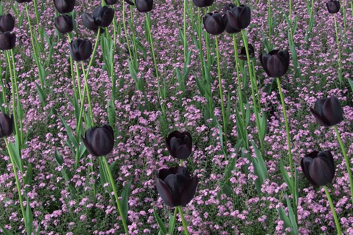 Osé et surprenant ce massif de tulipes noires sur un fond de myosotis roses. L’ensemble est pourtant du bel effet. La surprise est au printemps quand du tapis de myosotis fleuri lui très tôt surgissent les boutons noirs des tulipes.
