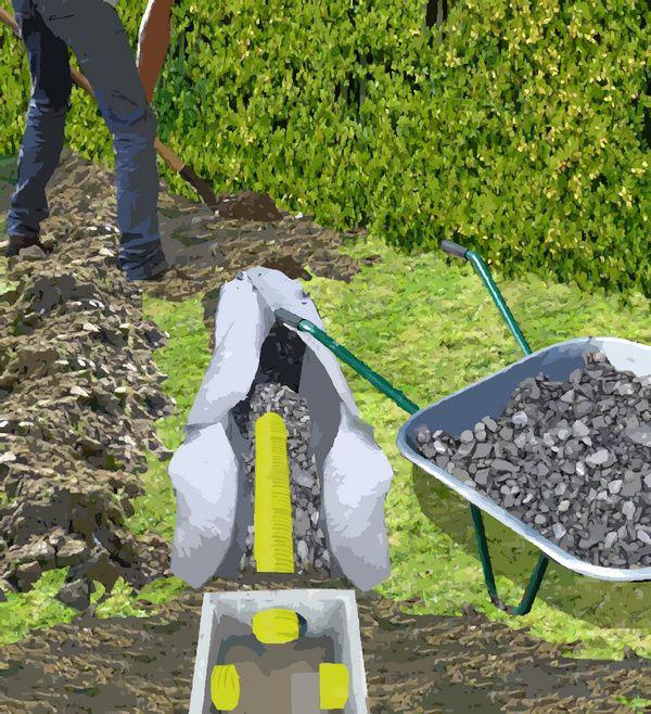 Les drains doivent être dirigés vers le collecteur d’eaux pluviales, un fossé naturel de bord de propriété.