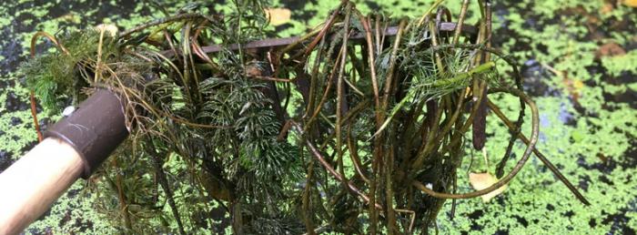 Si c’est une mare à l’aide d’un râteau, arrachez une partie des plantes immergées enracinées au fond pour limiter leur expansion.