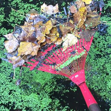 Un râteau pour les mares ou un balai à gazon très souple pour les bassins étanchéifié avec une bâche.