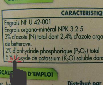 Lorsque vous achetez un engrais dans le commerce, veillez à ce qu’il soit bien dosé en potasse (c’est la lettre K dans la formule de composition).