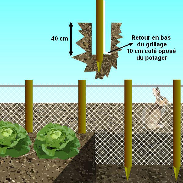Pour éviter que le lapin ne passe par dessous il faut creuser une tranchée de 40 cm minimum de profondeur.