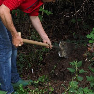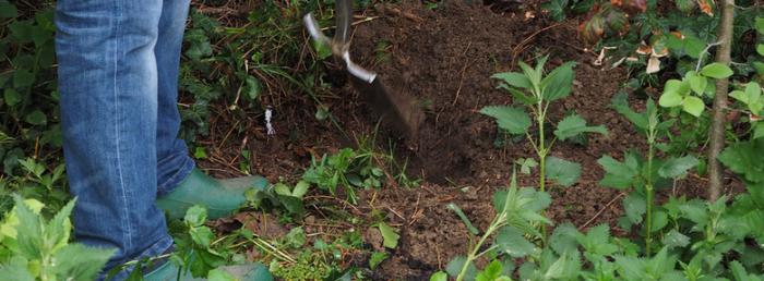 Creusez un trou d’au moins 50 cm de côté ou plus selon la taille de la motte. Décompactez le fond à la fourche-bêche. La terre ainsi remuée s’oxygène, ce qui profite à la microfaune et à la microflore superficielles.