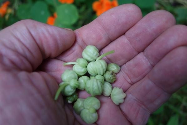 Contrairement aux véritables câpres (ici) élaborés avec des fleurs de câprier, avec la capucine ce sont les graines avant maturité qui sont employées.